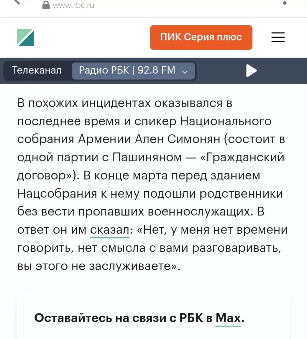 Armenian National Assembly Speaker Alen Simonyan sharply criticised Russian news portal RBC.ru, accusing it of spreading false information and demanding an apology from Russian media.