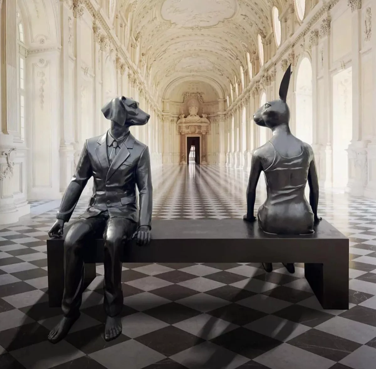 While the couple has gained international recognition for their monumental sculptures of African elephants, Masai giraffes, lowland gorillas, white rhinos, Arctic foxes, Bengal tigers, and other animals — helping their conservation message reach a global audience — it is their autobiographical characters, Rabbitwoman and Dogman, that firmly established them in the art world. Depicted as a rabbit and a dog, traditionally seen as prey and predator, these sculpted alter egos symbolize the idea that cooperation, love, respect, and collaboration can lead to a more peaceful world, regardless of differences.