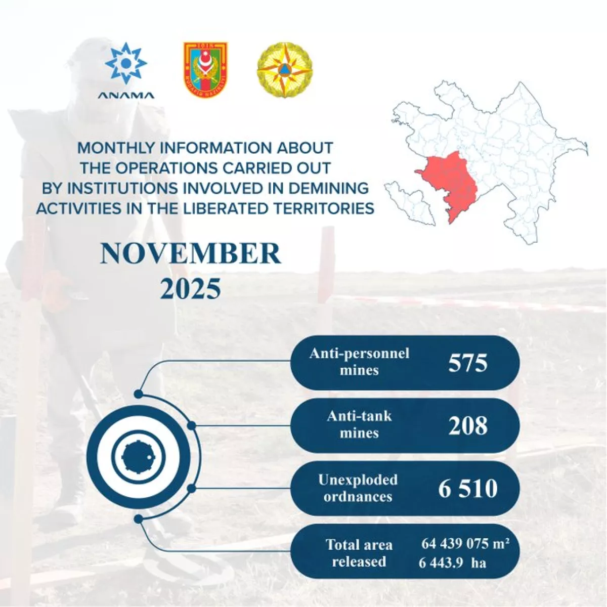According to information provided to Caliber.Az by the agency, during November, large-scale mine clearance efforts were carried out in the Tartar, Aghdara, Kalbajar, Aghdam, Khojaly, Khojavand, Lachin, Shusha, Fuzuli, Gubadli, Jabrayil, Gazakh, and Zangilan districts, as well as in the city of Khankendi.