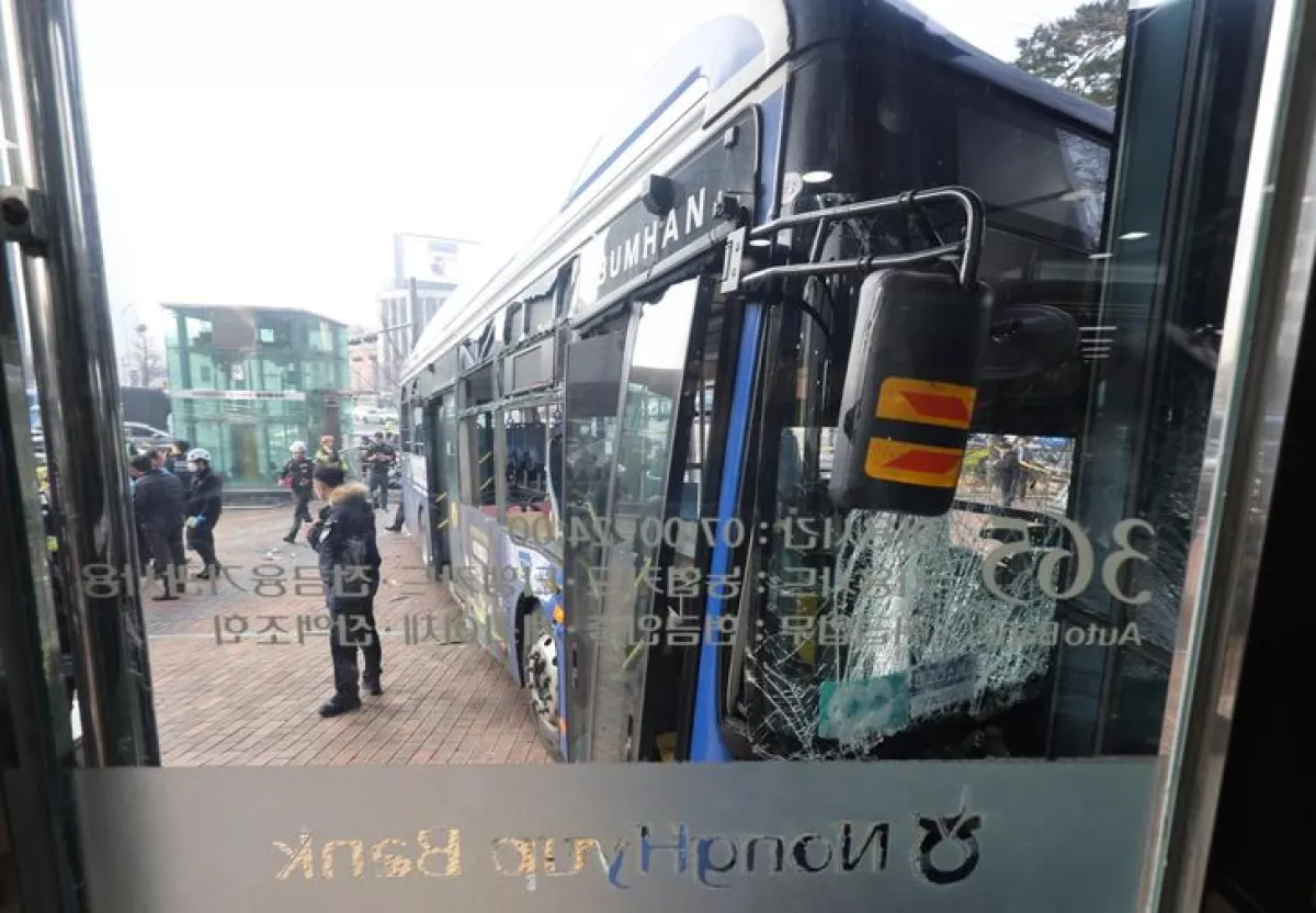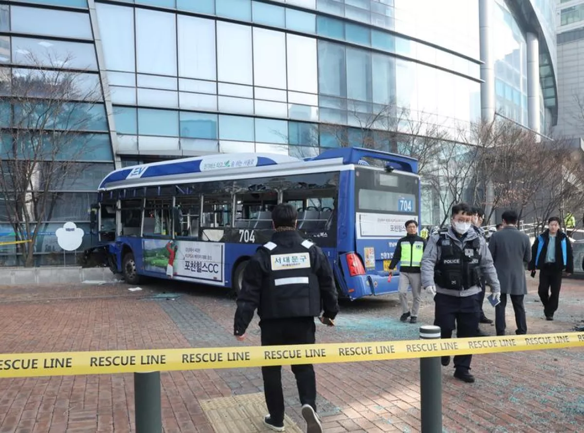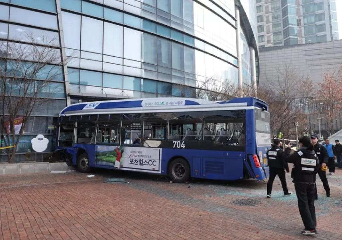 The accident occurred near Seodaemun Station on Seoul Subway Line 5 when the bus reportedly drove over a pedestrian sidewalk before striking the bank’s glass facade. Video footage from YTN TV showed the bus’s front embedded in the building’s exterior.