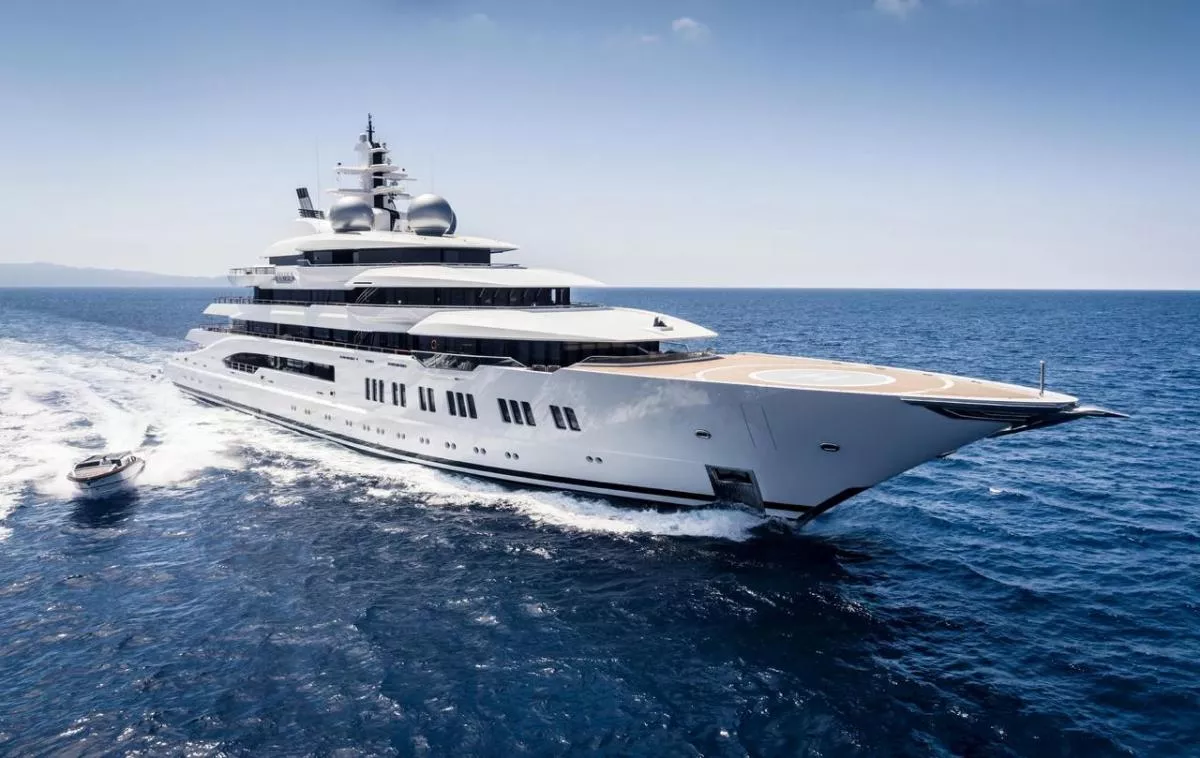 Built by the German company Lürssen — which also constructed yachts for Sergey Brin and Barry Diller — the vessel features six decks with an infinity pool, jacuzzi, two spa zones, a private cinema, a helipad, and even a lobster tank. Inside, it boasts a gilded bar, a luxury piano, and gold-accented elevators.