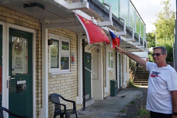 Locals couldn't believe it when they saw the massive Russian flags flying outside the elderly man's flat, and say that unless something is done about the display "it could cause problems."
