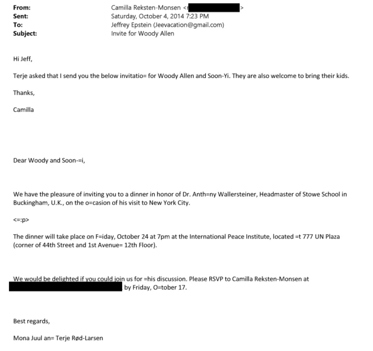 But this was only the first sign. In October 2014, the diplomat’s assistant, Camilla Reksten-Monsen, sent an email to Epstein’s personal account. The subject line read: “Invite for Woody Allen.” The body of the message stated: “Terje asked that I send you the below invitation for Woody Allen and Soon-Yi… We have the pleasure of inviting you to a dinner in honor of … Headmaster of Stowe School… The dinner will take place on Friday, October 24, 7pm at the International Peace Institute, located at 777 UN Plaza. Best regards, Mona Juul and Terje Rod-Larsen.”