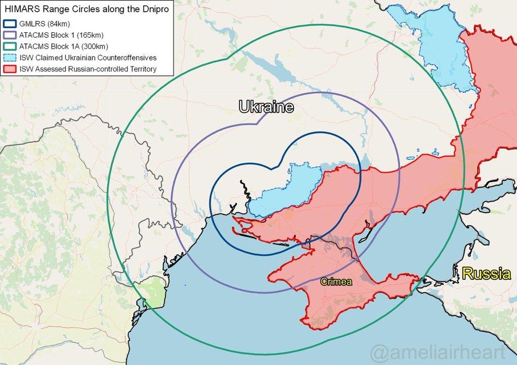 Approximate range for GMLRS launched from HIMARS vic Kherson is the blue circle. I imagine this will start soon, and will degrade/fix Russian defenses and LOC's north of Crimea. This also shows clearly why ATACMS would have immediate positive effect vs Russian bases in Crimea. pic.twitter.com/VNv3SmTKpj