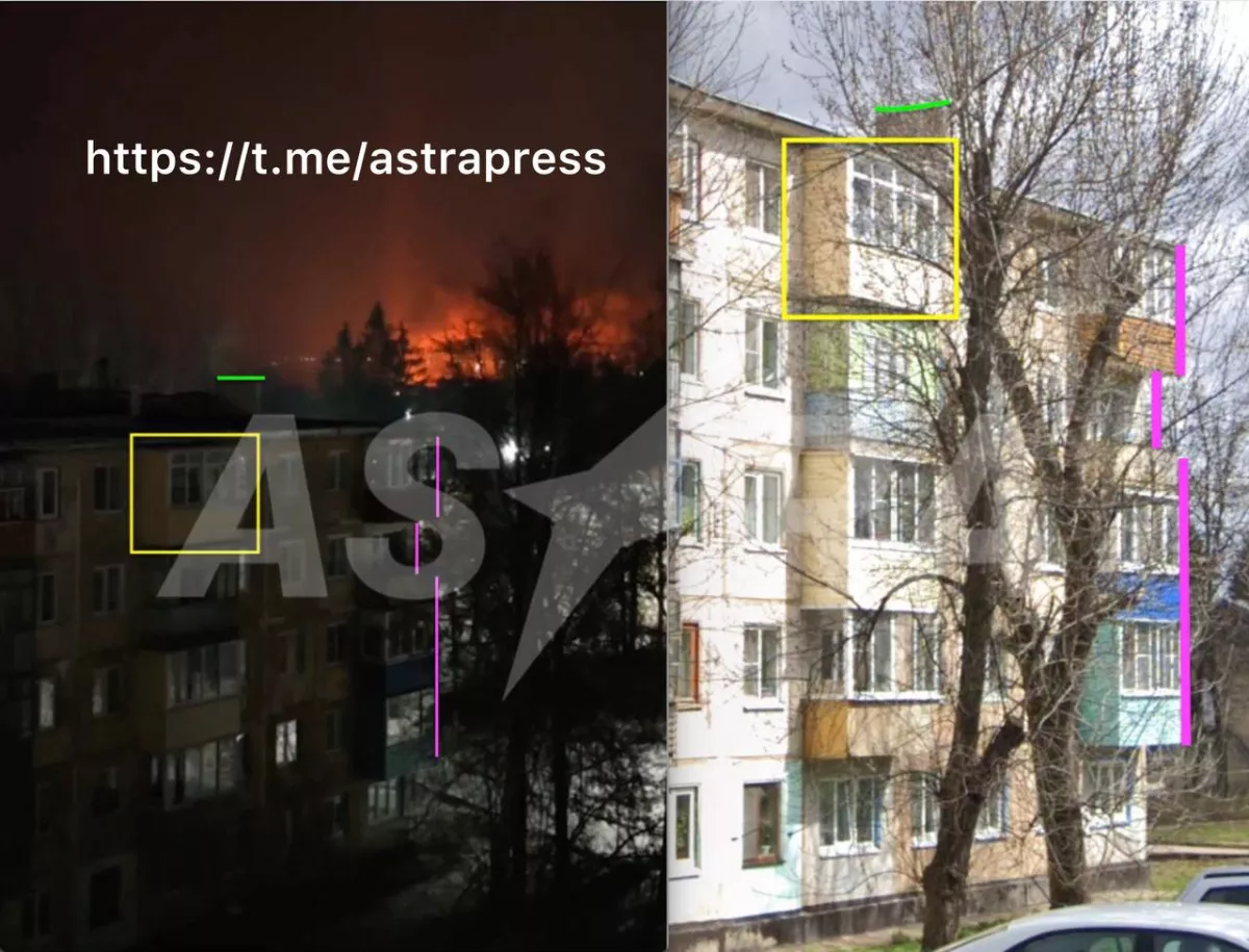 ASTRA analysed and geolocated available footage from the scene, confirming that the glow from the fire was visible in the area of the plant. Based on this analysis, the fire appears to have occurred near the local synthetic rubber factory, although the exact point of impact cannot be determined from the footage.