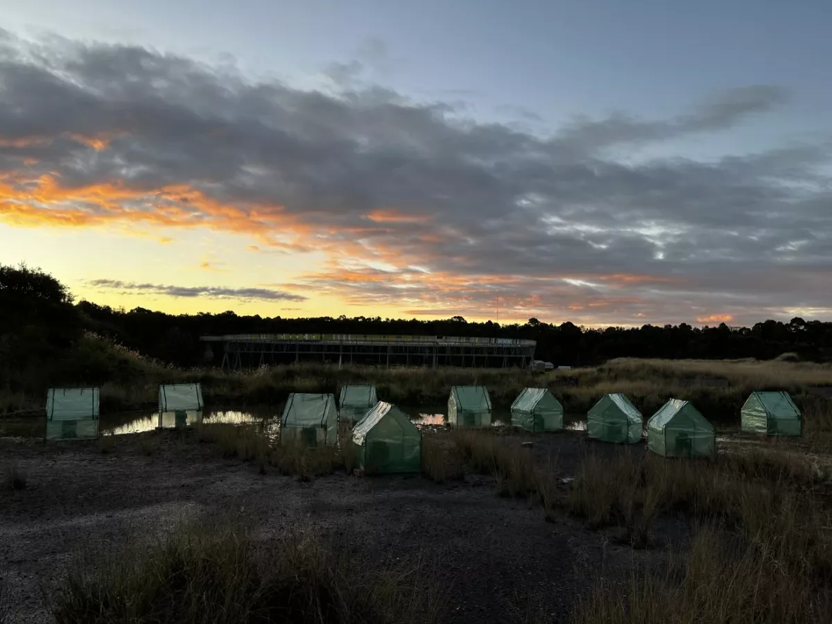 Macquarie University biologist Anthony Waddle has developed small heated shelters where endangered green and golden bell frogs can raise their body temperature.