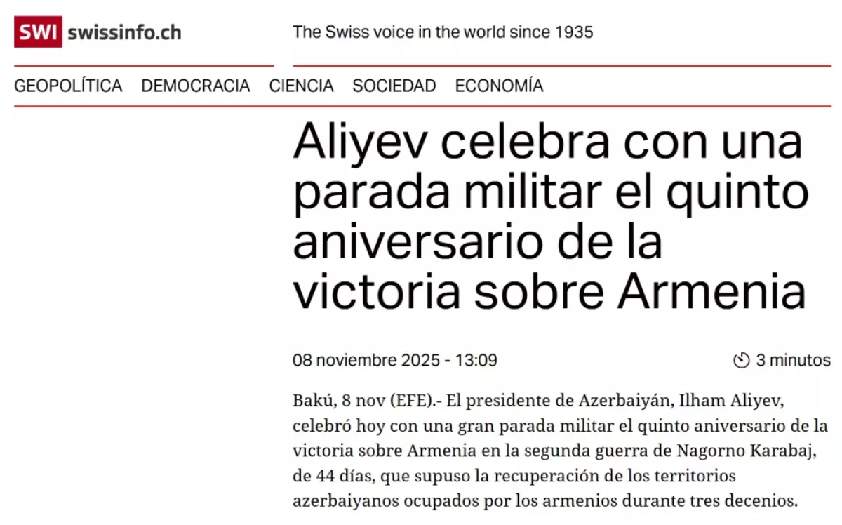 The Spanish agency EFE also paid special attention to the military parade. In the information published by the agency, particular emphasis was placed on the participation of the leaders of Türkiye and Pakistan in the military parade dedicated to the fifth anniversary of the Victory in the Second Karabakh War. The report included statements by the presidents of Azerbaijan and Türkiye, the Prime Minister of Pakistan, as well as the leaders’ views that Azerbaijan’s Victory opened a new chapter for peace, development, and security in the region. This news was also published by the Swiss media outlet Swissinfo.ch citing EFE.