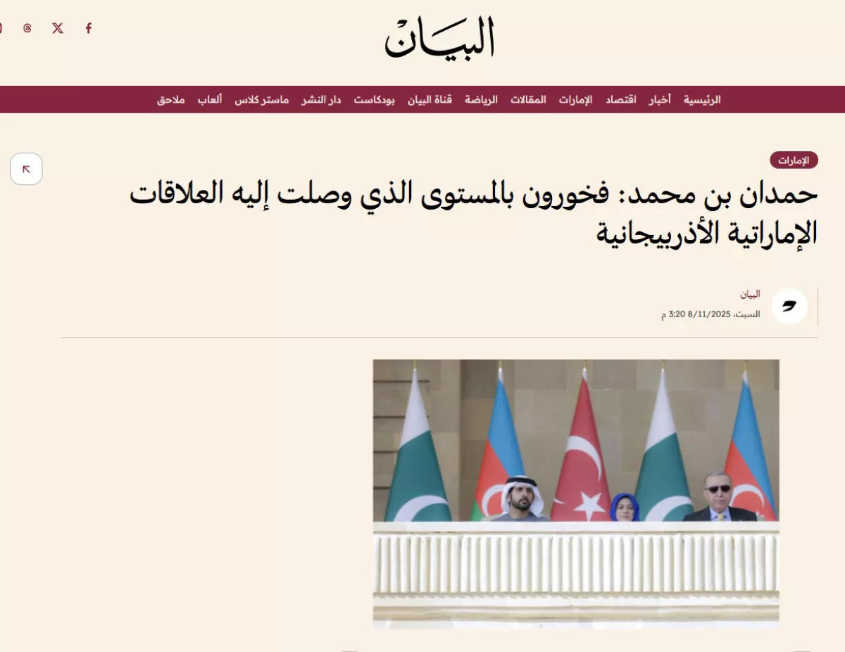 Leading media outlets of the United Arab Emirates, including the portals UAE BARQ, Emarat Al Youm, Al Bayan, Sharjah24, and 20Four, also widely covered the military parade dedicated to the fifth anniversary of the Victory in the Patriotic War. The reports provided detailed coverage of the scale of the parade, the military equipment demonstrated, and the military power of the Azerbaijani army. Special attention was paid to the statements of the President of the Republic of Azerbaijan Ilham Aliyev, the President of Türkiye Recep Tayyip Erdoğan, and the Prime Minister of Pakistan Muhammad Shehbaz Sharif made during the parade. The materials also reflected the statements of the leaders of Azerbaijan and Türkiye on regional cooperation and ensuring peace and stability in the South Caucasus.