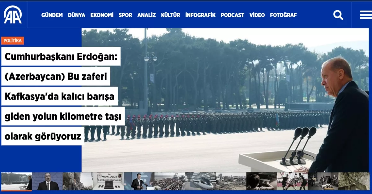 The publications included quotes from the statements of the leaders of Türkiye and Azerbaijan about the need to ensure lasting peace and stability in the South Caucasus, the close fraternal unity between Baku and Ankara, and the development of regional cooperation. In the "Main News" section of Anadolu agency, particular attention was given to President Ilham Aliyev’s words that the statement made by President of Türkiye Recep Tayyip Erdoğan during the Patriotic War, “Azerbaijan is not alone, Türkiye is beside Azerbaijan!” was a very serious message to the whole world, as well as President Aliyev’s statement: “The Azerbaijani people will never forget this fraternal support.” A quote from President of Türkiye Recep Tayyip Erdoğan was also highlighted: “We perceive this victory not as a conclusion, but as another step towards long-term peace in the Caucasus.”