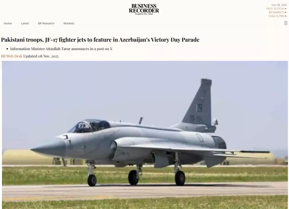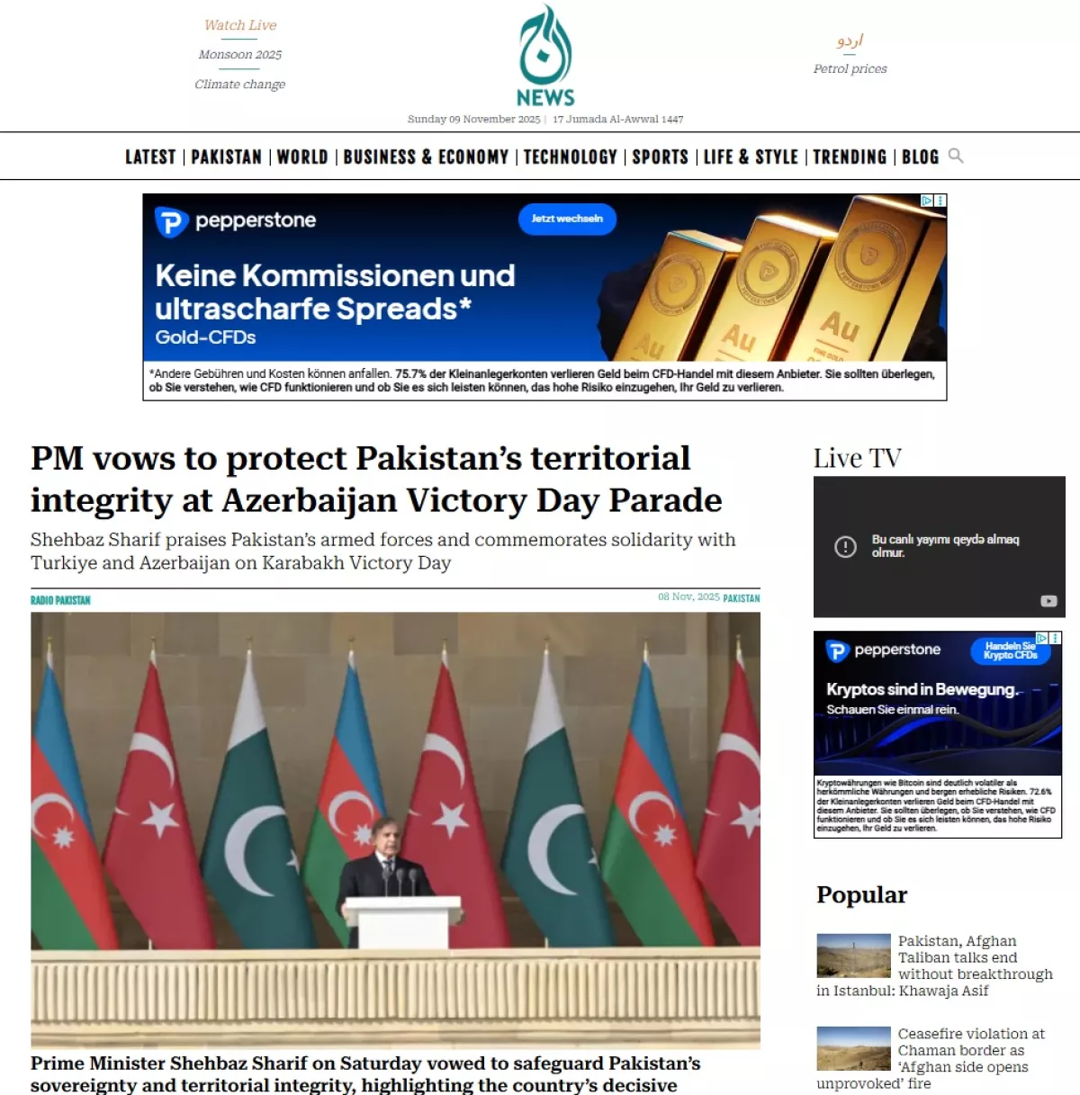 Leading media outlets of Pakistan, including ARN News Centre, AAJ News (AAJ TV), The Express Tribune, Brecorder, Geo News, 24 News HD, and Minute Mirror, reported on the scale of the military parade, the joint participation of the armed forces of Azerbaijan, Türkiye, and Pakistan, as well as the military equipment and aviation demonstrated. Special attention was given to the speech of the President of the Republic of Azerbaijan, and the statements of the head of state about the decisive support provided by Türkiye and Pakistan to Azerbaijan during the Patriotic War were widely covered. It was also noted that President Ilham Aliyev expressed gratitude to Pakistan for its firm support in Azerbaijan's just struggle and highly appreciated Islamabad’s role in ensuring regional stability in South Asia. The publications particularly emphasized the participation of Prime Minister Muhammad Shehbaz Sharif in the parade, noting the close cooperation of the armies of the three fraternal countries. Pakistani media also highlighted the significance of the parade in terms of strengthening regional cooperation and consolidating peace and stability in the South Caucasus. In this context, The Express Tribune especially noted the statement of the Prime Minister of Pakistan at the military parade regarding friendship and regional solidarity.