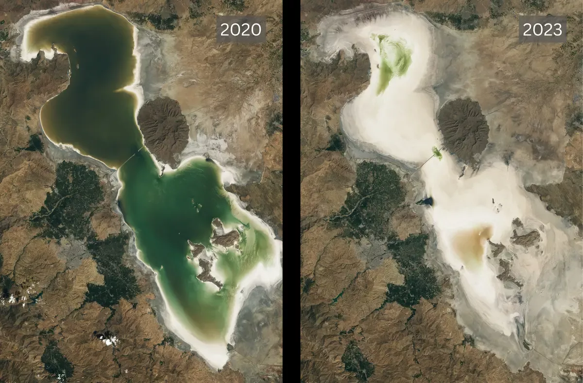 One of the most striking examples is Lake Urmia, once the largest lake in the Middle East, which satellite imagery from NASA shows has almost completely dried up. Research indicates that salt-laden dust from the lakebed can travel hundreds of miles within hours, significantly degrading air quality across wide regions.