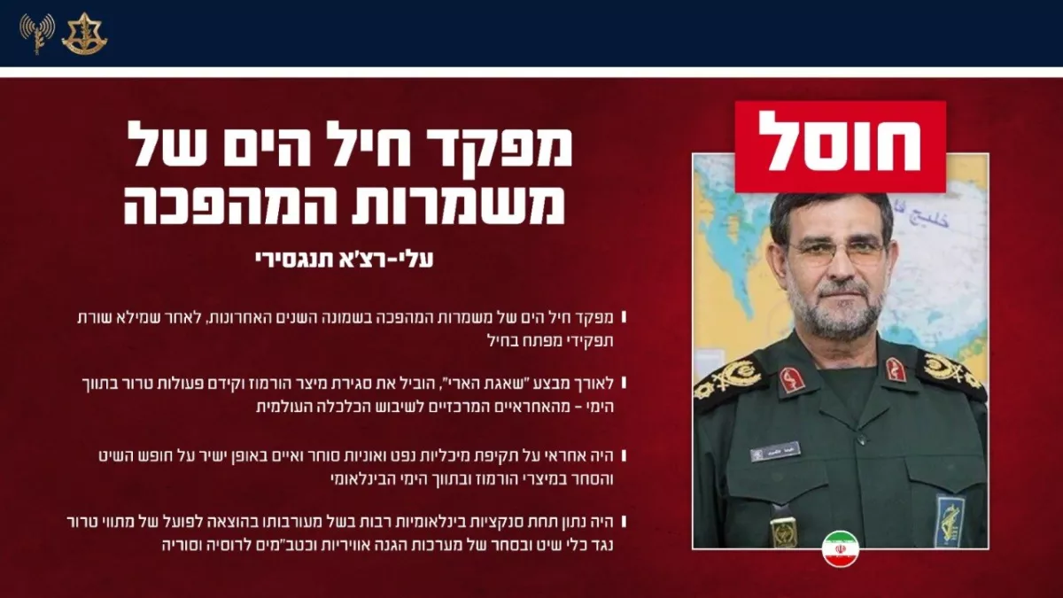 The IDF added that during what it described as Operation Roaring Lion, Tangsiri led efforts aimed at closing the Strait of Hormuz and advancing attacks in the maritime domain, calling him “one of the primary figures responsible for disrupting the global economy.”