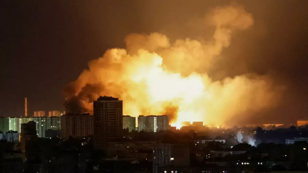 A strike hit Kyiv’s Solomianskyi district, Ukraine, overnight, triggering a large fire, according to local groups.