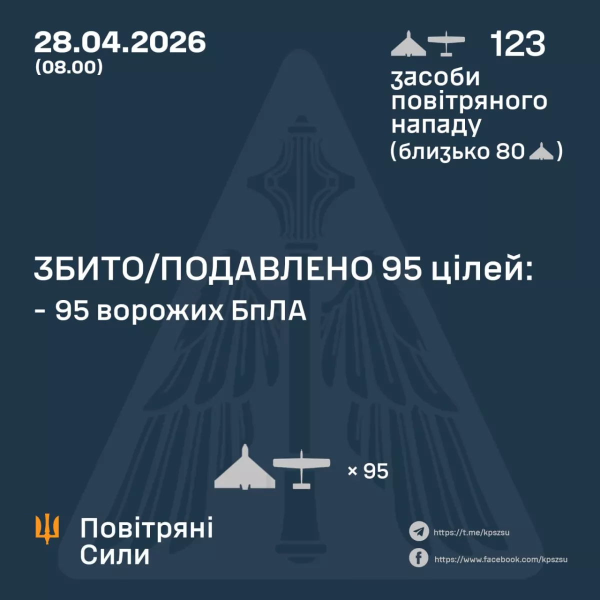 During the night of April 28, Russia launched 123 strike drones of various types against Ukraine, including Shahed, Gerbera, Italmas, and other unmanned aerial vehicles. Around 80 of them were Shahed drones, according to the Ukrainian Armed Forces.