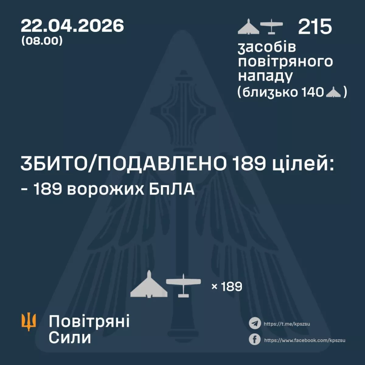 According to preliminary data released by the Ukrainian military as of 08:00, air defence systems intercepted or suppressed 189 of the UAVs across the northern, southern, and eastern regions of the country.
