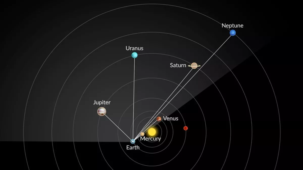 From Earth’s viewpoint, the planets will be positioned within a narrow section of the ecliptic. Four of them will be visible to the naked eye, while the two most distant planets will require optical instruments.