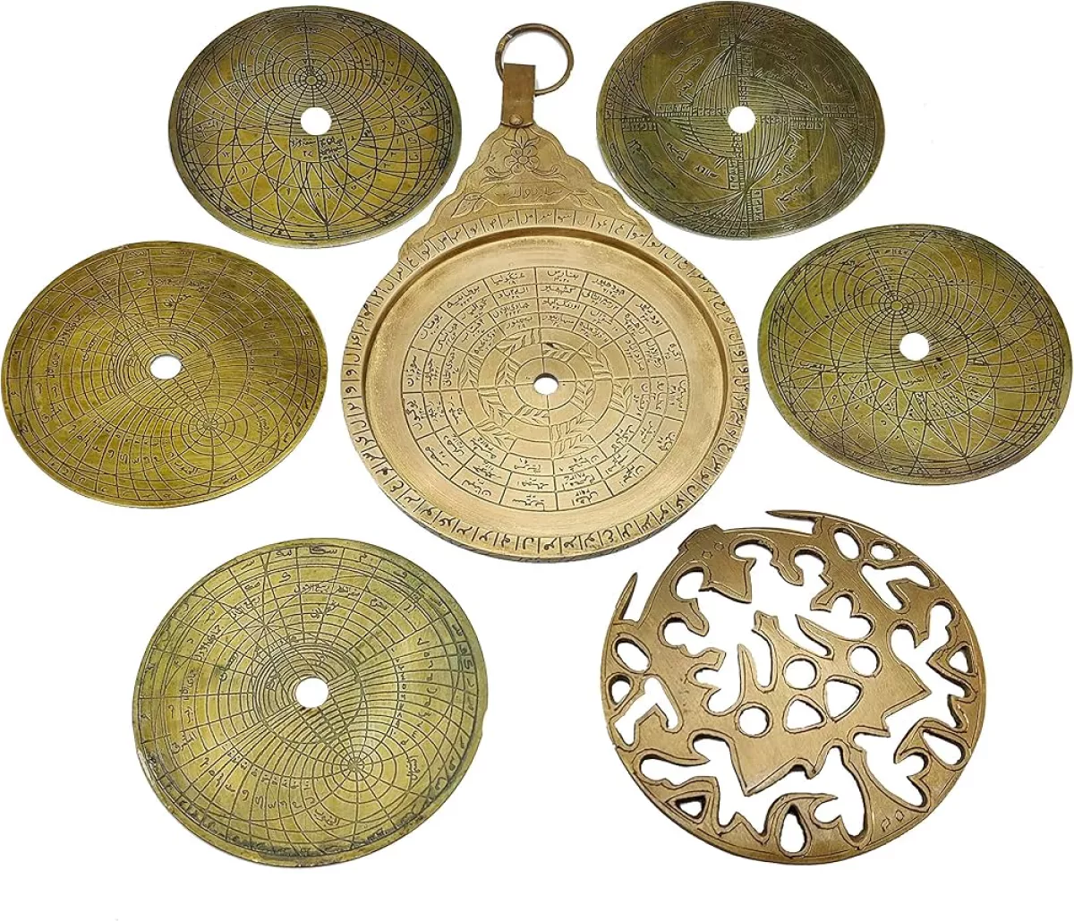 Astrolabes are intricate metal discs composed of layered, interlocking parts, historically used for a wide range of calculations—from telling time and charting stars to determining the direction of Mecca and mapping celestial motion.