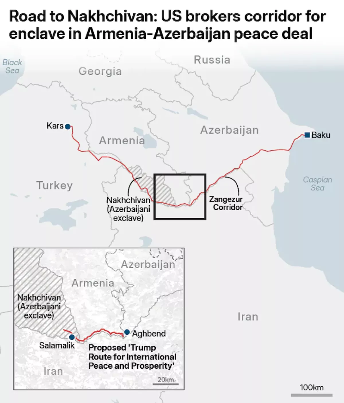 Besides initialling the peace treaty, Azerbaijani President Ilham Aliyev and Armenian Prime Minister Nikol Pashinyan signed a declaration to allow Yerevan to work with Washington to develop the so-called “Trump Route for International Peace and Prosperity” (TRIPP) through about 40km of southern Armenian territory, connecting Azerbaijan to Nakhchivan.