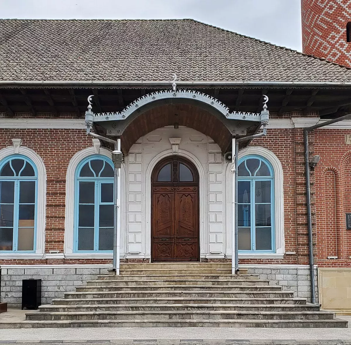 The mosque represents a striking example of regional religious architecture, where traditional forms are harmoniously combined with a carefully considered spatial composition. The elongated rectangular volume of the building and its calm architectural lines integrate seamlessly into the surrounding urban environment. The proportions of the structure are meticulously calculated. The façades are designed with restraint, yet the rhythmic alternation of arched windows gives the building expressiveness and visual lightness. Wooden window shutters add warmth to the mosque’s façade, creating a picturesque accent.