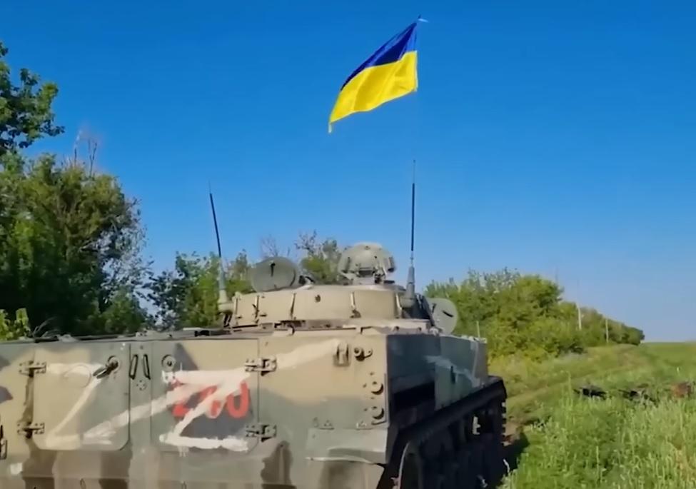 A Russian infantry fighting vehicle now flying Ukrainian colours after it was reportedly captured by reservist troops while under tank and mortar fire.
