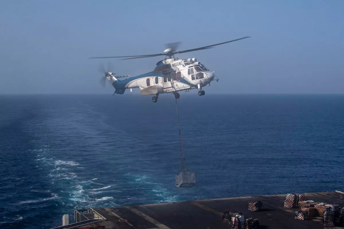 The operation involved a vertical replenishment with the supply vessel USNS Carl Brashear (T-AKE 7), allowing the carrier to take on essential provisions while remaining deployed.