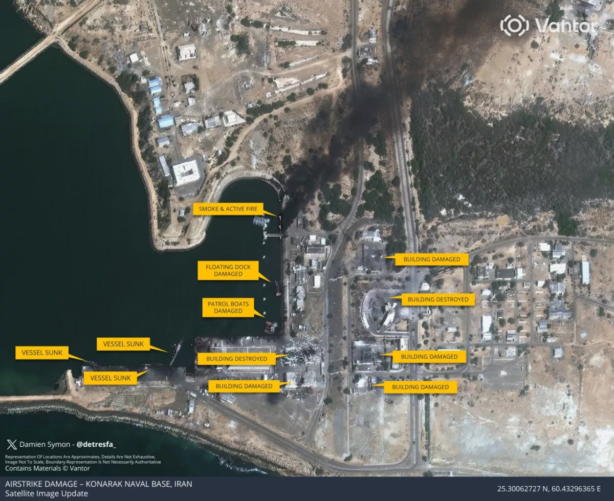 Satellite images show three sunken ships and significant damage at Iran’s Konarak naval base, according to Clash Report.