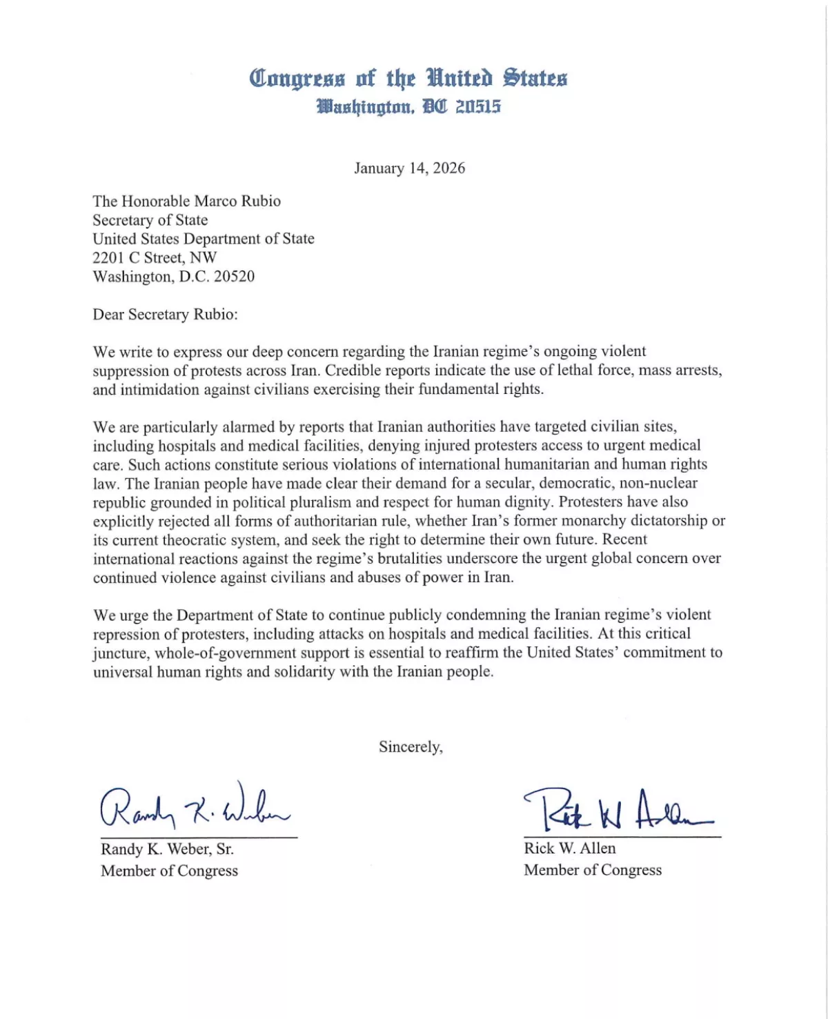 "I joined 58 of my colleagues in a bipartisan letter urging the Department of State to continue publicly condemning the Iranian regime's violent repression of protesters, including attacks on hospitals and medical facilities," he wrote.