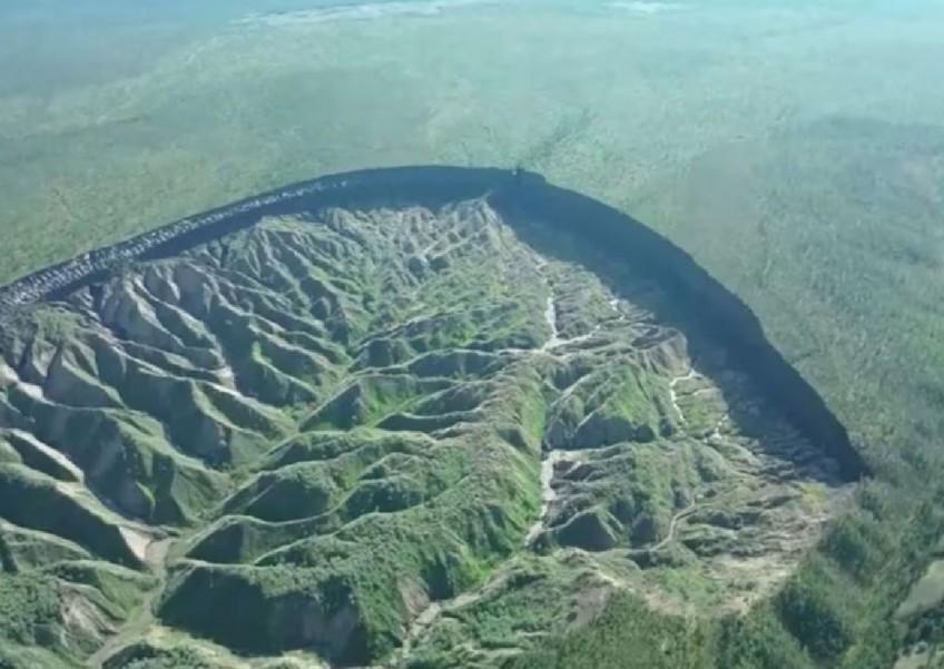 Stunning drone footage has revealed details of the Batagaika crater, a one-kilometre-long gash in Russia's Far East that forms the world's biggest permafrost crater.