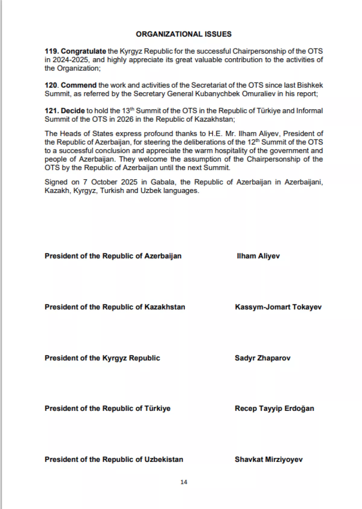 В документе также отмечается, что неформальный Саммит ОТГ пройдет в 2026 году в Казахстане.