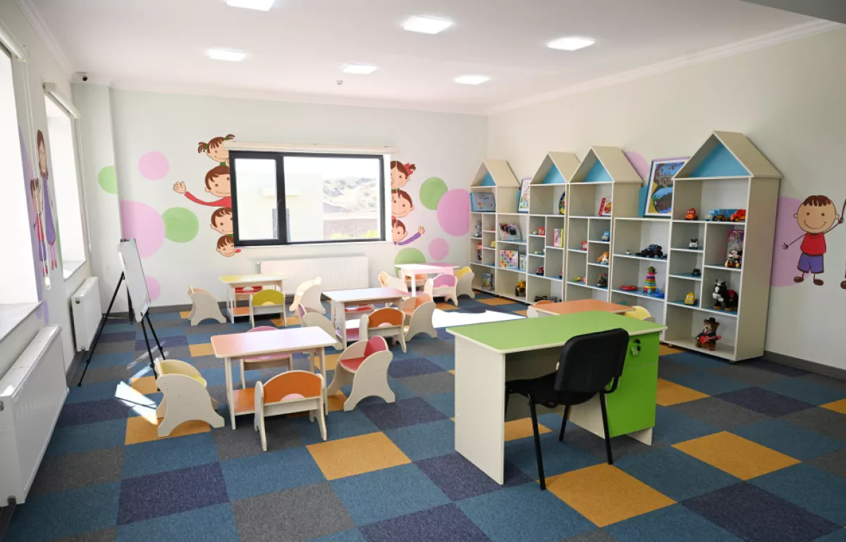 В построенном в селе детском саду особое внимание уделено обеспечению комфортных условий для детей. В детском саду в распоряжение детей будут переданы столовая, игровая и музыкальная комнаты. Кроме того, в здании имеются административный, компьютерный и методический кабинеты. Также созданы условия для интересного проведения детьми своего досуга.