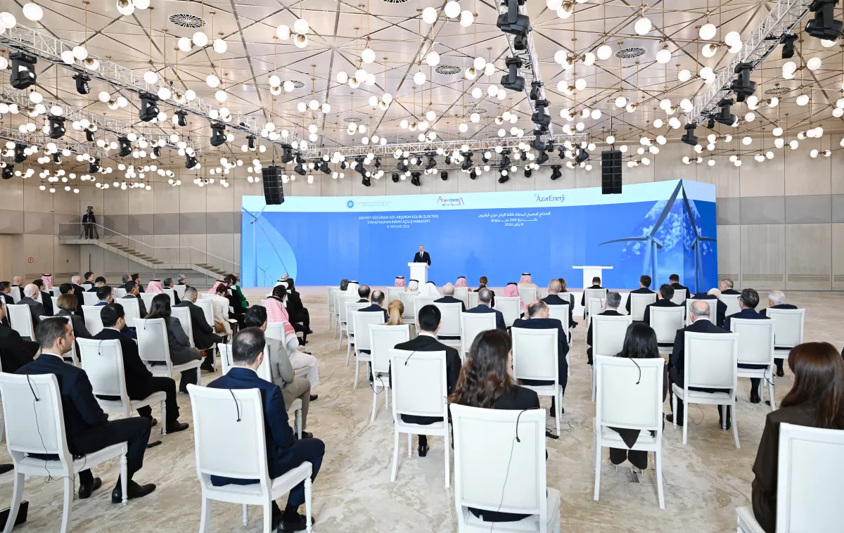 Президент Азербайджанской Республики Ильхам Алиев и учредитель и исполнительный директор компании ACWA Power Мухаммад Абунайян запустили ветряную электростанцию «Хызы-Абшерон» мощностью 240 МВт.
