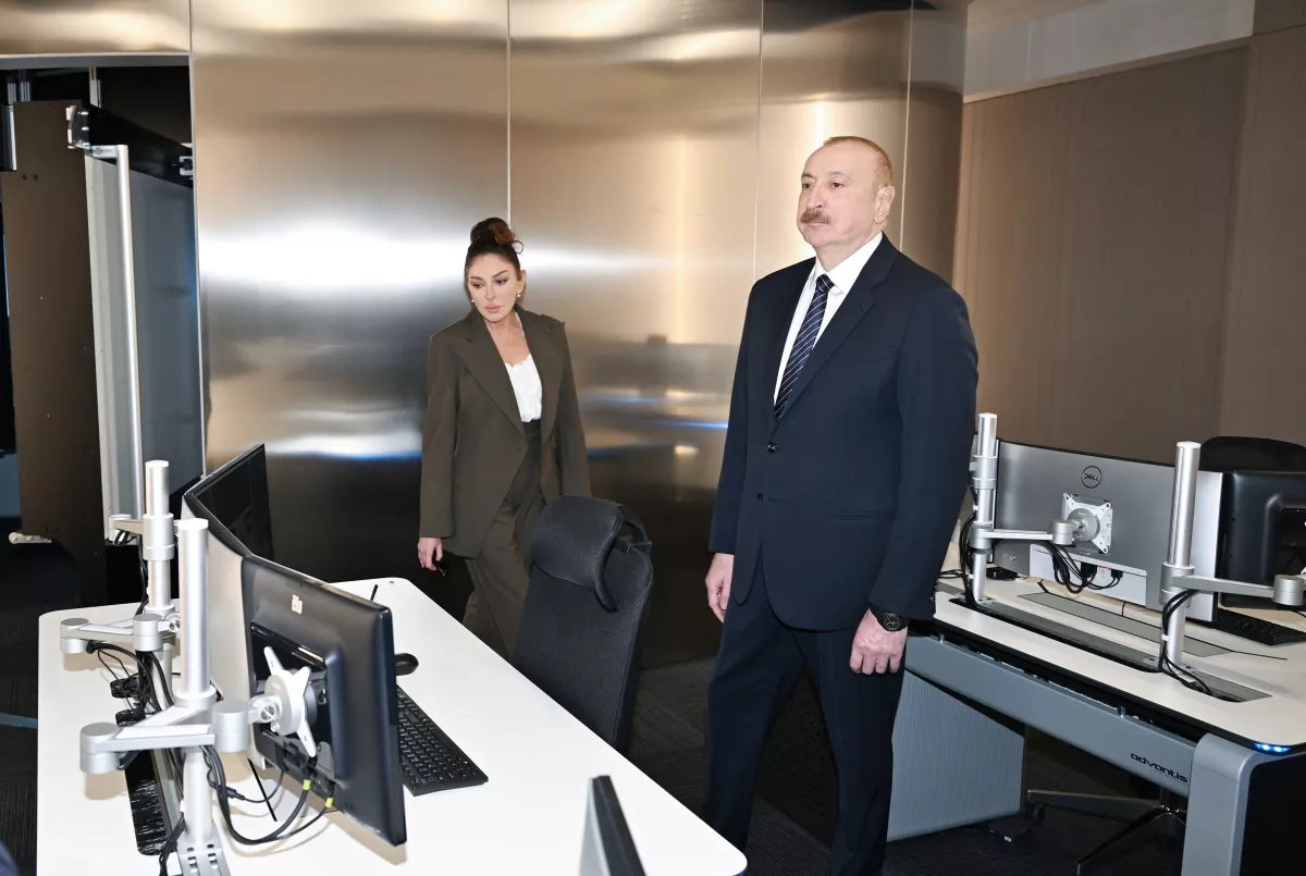 Ректор академии Ариф Пашаев, министр цифрового развития и транспорта Рашад Набиев и председатель правления ЗАО «Азербайджанские авиалинии» Самир Рзаев проинформировали президента и первую леди о центре.