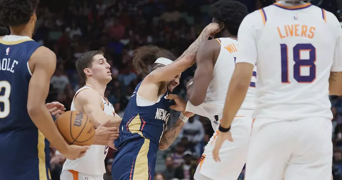 В матче регулярного чемпионата НБА между «Нью-Орлеаном» и «Финиксом» (114:123) произошла драка.