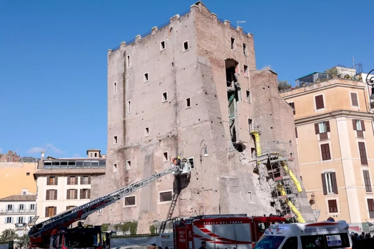 Обрушение башни Torre dei Conti на Императорских форумах произошло около полудня понедельника. Затем последовало повторное обрушение. Башня находилась на реконструкции и была обнесена заграждениями.
