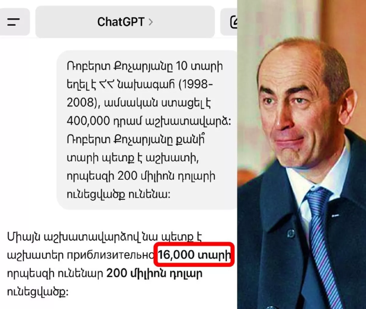 «По расчётам искусственного интеллекта, Кочаряну (экс-президенту Армении Роберту Кочаряну, — ред.) пришлось бы работать как минимум 16 тысяч лет, чтобы накопить подобное имущество.