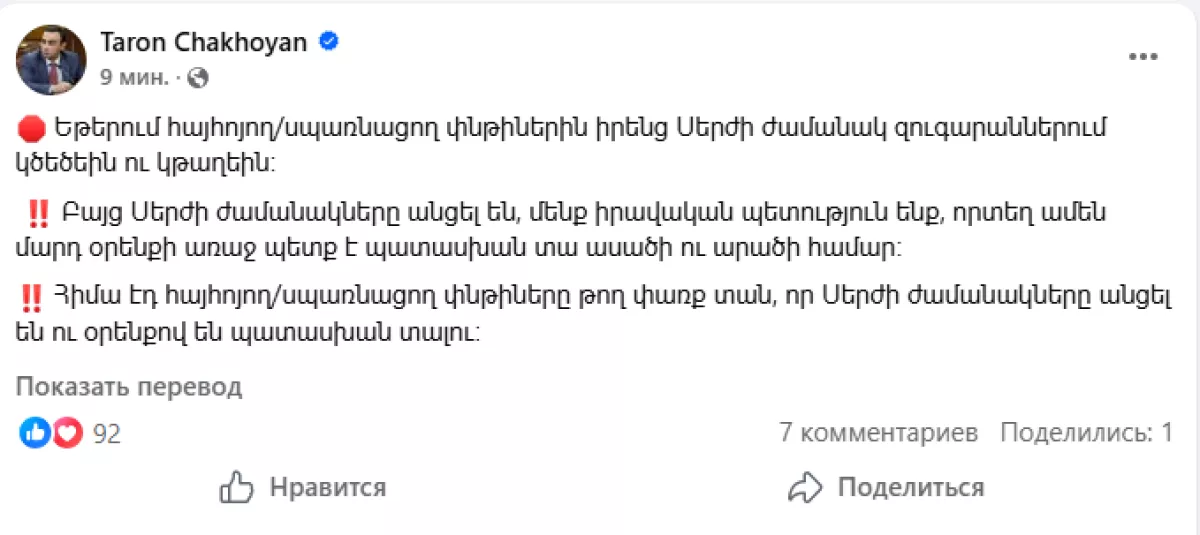 Теперь этим оскорбляющим и угрожающим подонкам пусть будет известно, что времена Сержа прошли и они будут отвечать по закону», — написал Чахоян.