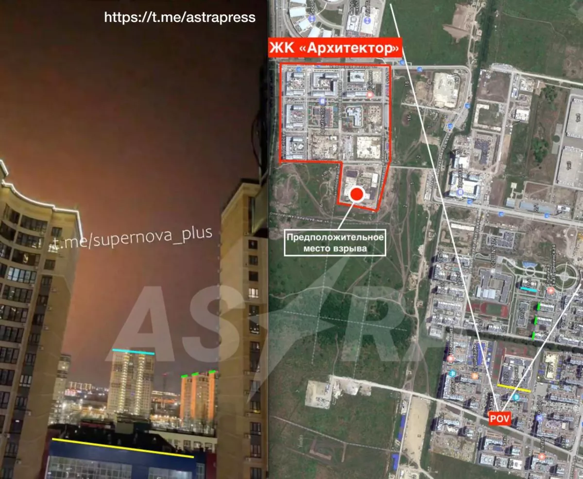 На кадрах «Supernova +», которые сняты с ул. Григория Булгакова, видна вспышка и взрыв. Исходя из задержки звука взрыва относительно вспышки, расстояние от точки съемки до места взрыва составляет примерно 1,3 км.