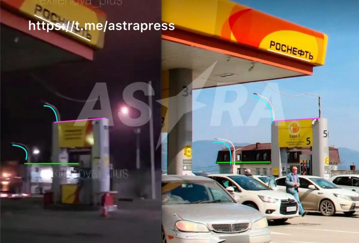 Согласно анализу ASTRA, видео снято с АЗМ «Роснефть» на Мысхакском шоссе, с расстояния примерно 6.5-7 километров до места пожара.