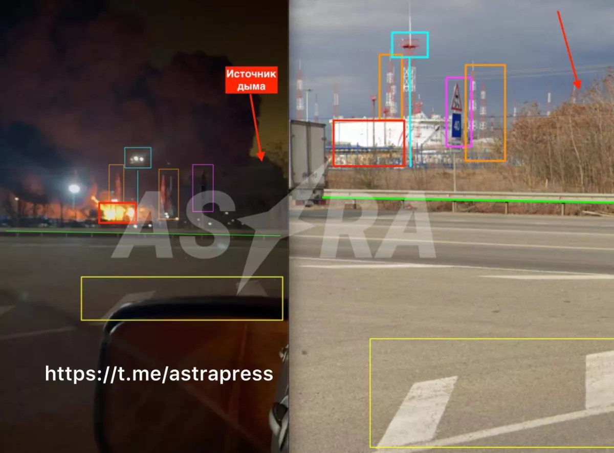 «На кадрах запечатлены два источника возгорания. Открытое горение, похоже, перед резервуаром, но и сзади мощно валит дым, — похоже, горят резервуары с топливом», — считает аналитик ASTRA.