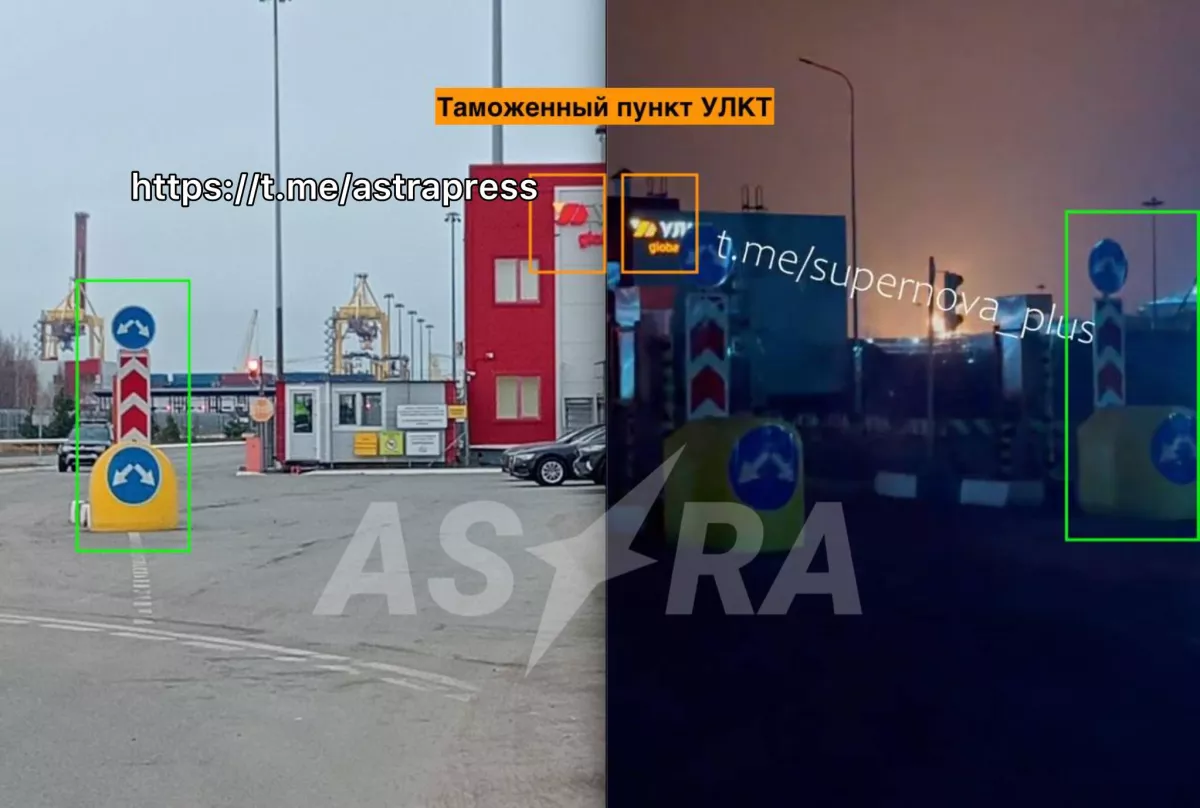 Фото снято из поселка Усть-Луга, видео, опубликованное каналом Supernova+, — с Таможенного поста Усть-Лужский.