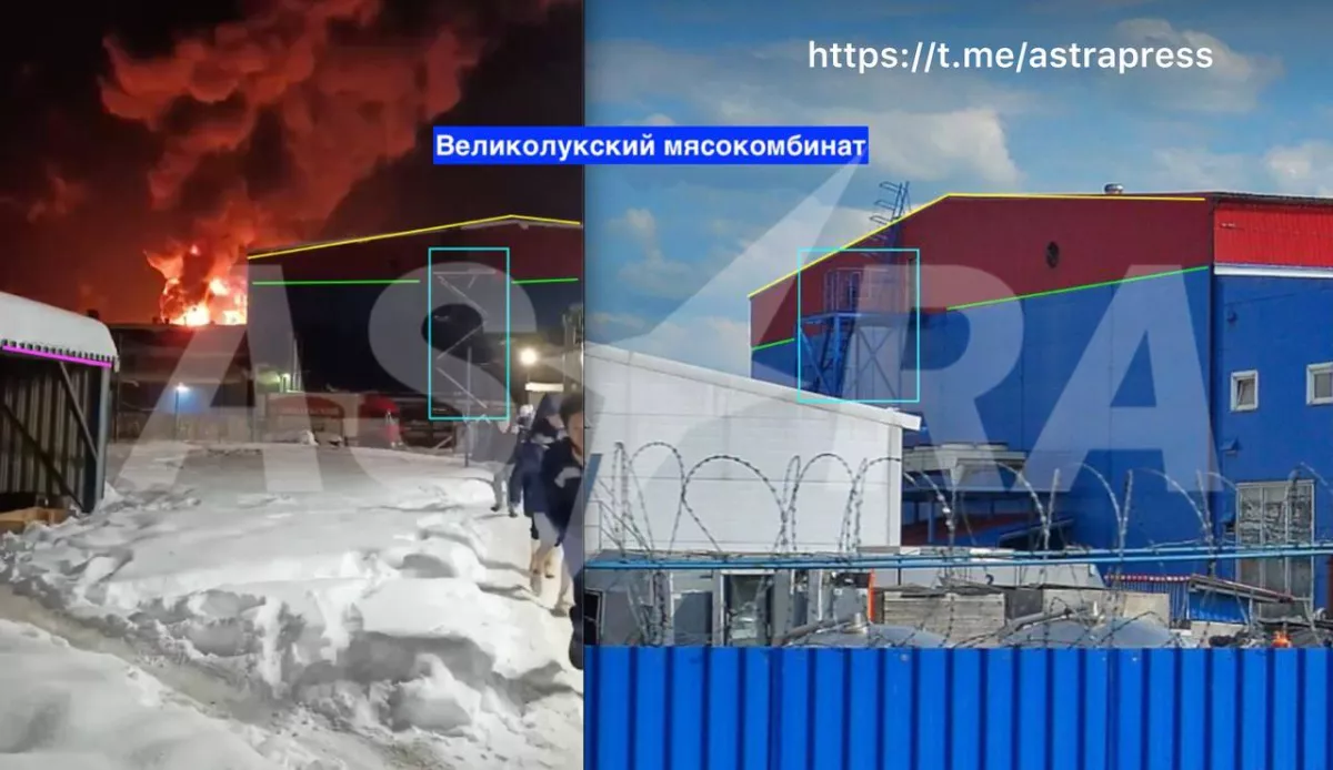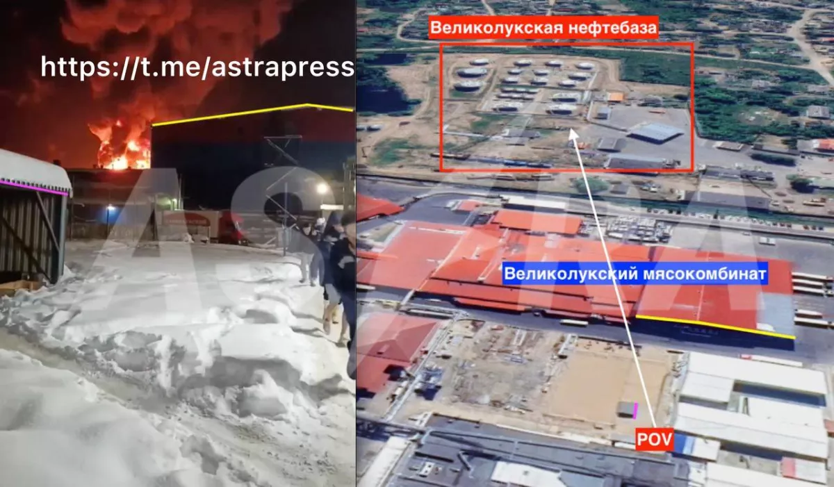 Согласно анализу ASTRA одного из видео очевидцев, кадры сняты с территории Великолукского мясокомбината, расположенного по адресу: Литейная ул., 17. Работники этого комбината, по всей вероятности, и убегают на видео в первые минуты после атаки. Расстояние от места съемки до нефтебазы — около 300 метров. На кадрах горит «Великолукская нефтебаза», расположенная по адресу: Литейная ул., 19.