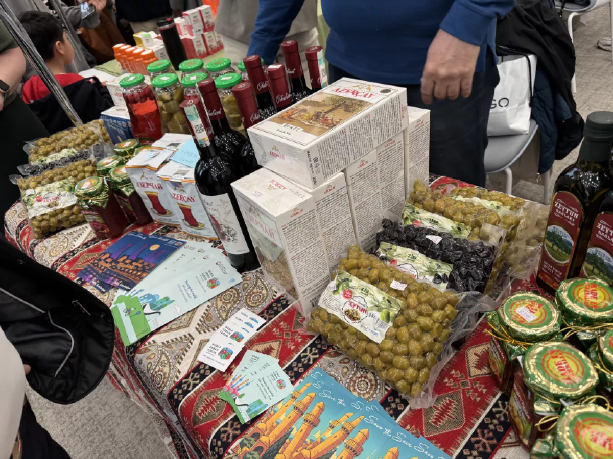 На стенде Азербайджана представлены оливки, оливковое масло, шафран, чай, варенья, а также сувениры с национальной символикой, буклеты и открытки с изображением Баку.