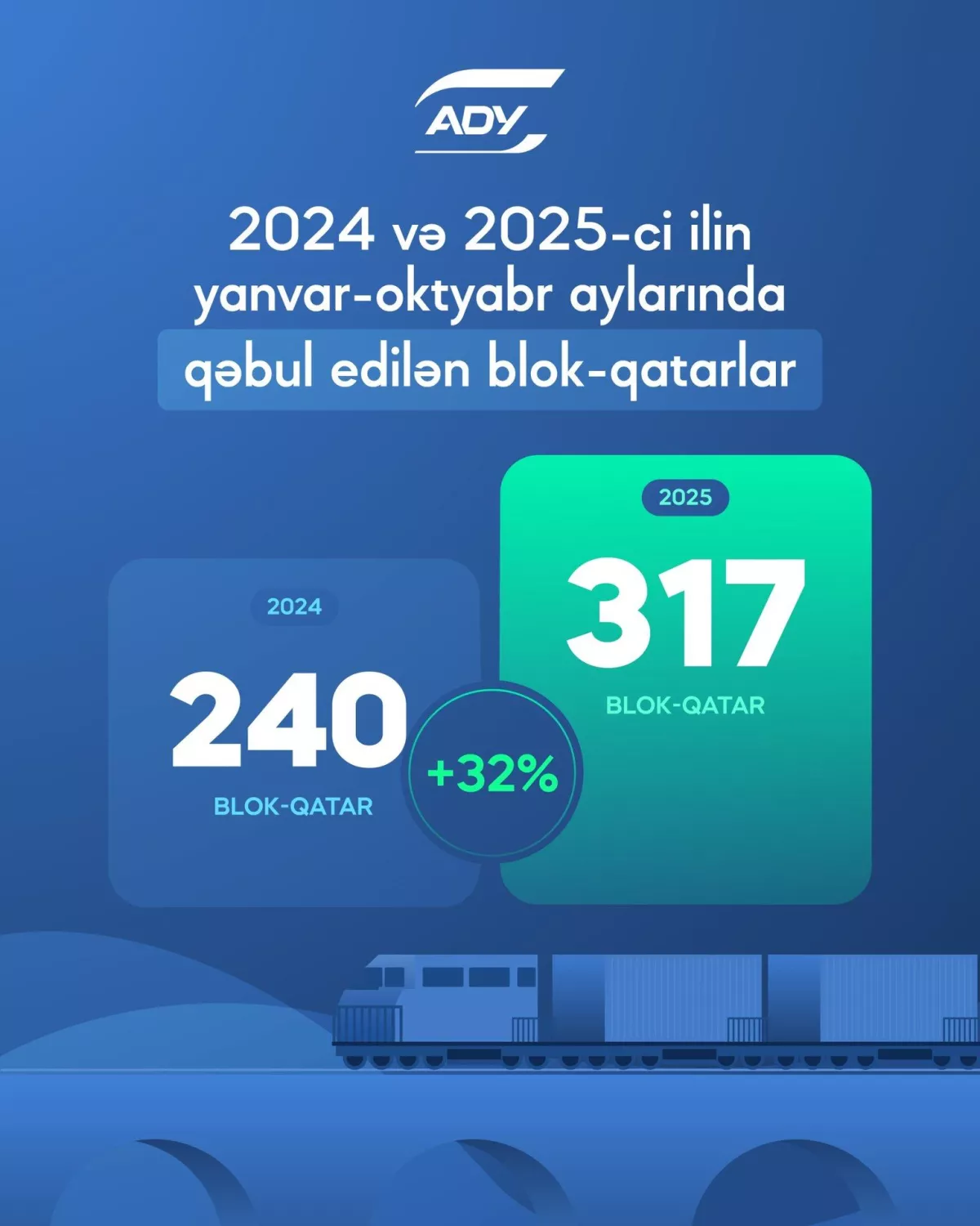 В январе - октябре этого года Азербайджан принял 317 блок-поездов, из них 119 транзитных. Это на 32% больше, чем за первые 10 месяцев 2024 года.