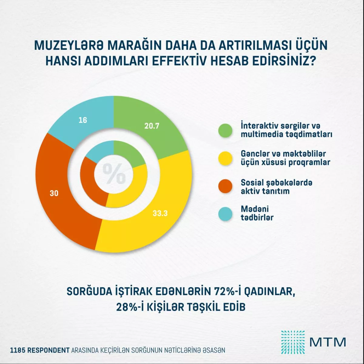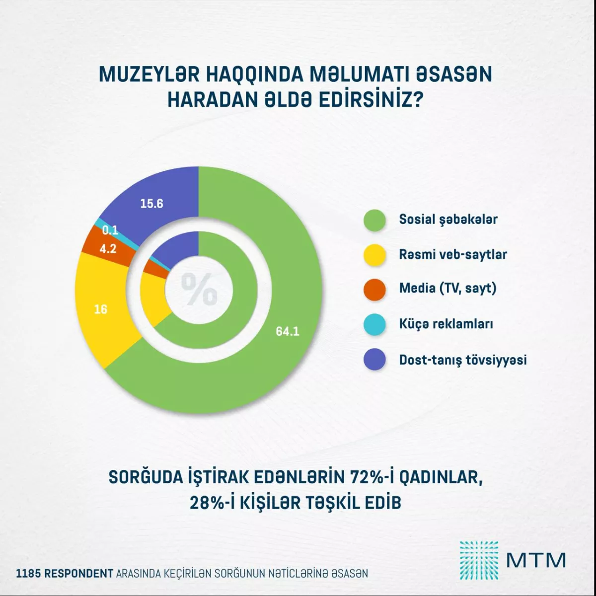 77,2% респондентов чаще посещают исторические, 61,2% опрошенных — художественные музеи. Среди наиболее посещаемых — Национальный музей истории Азербайджана, Национальный музей искусств, Музей ковра и дома-музеи.
