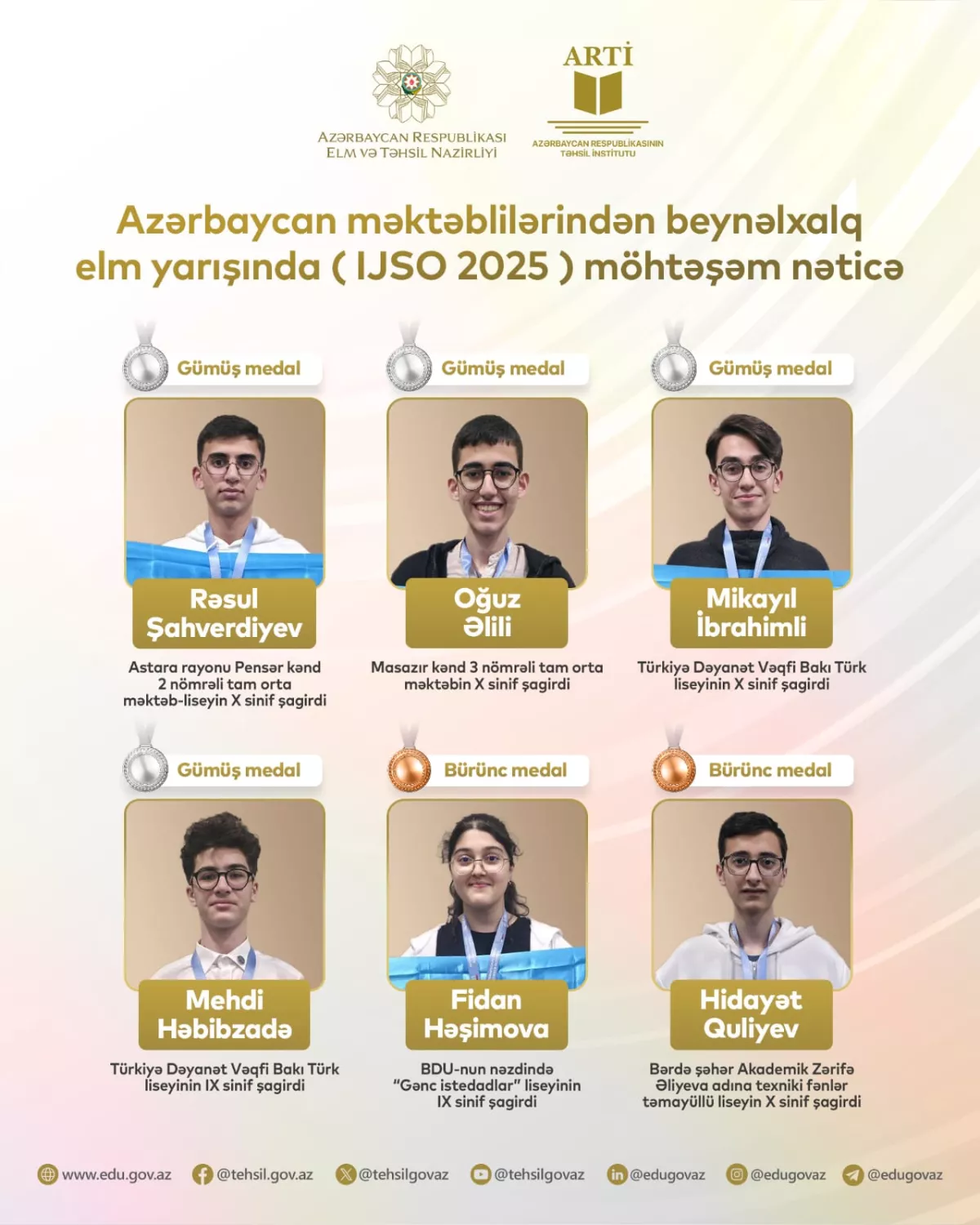 Азербайджанские школьники добились высоких результатов на Международной естественно-научной олимпиаде юниоров (IJSO-2025), проходившей в России с 23 ноября по 2 декабря.