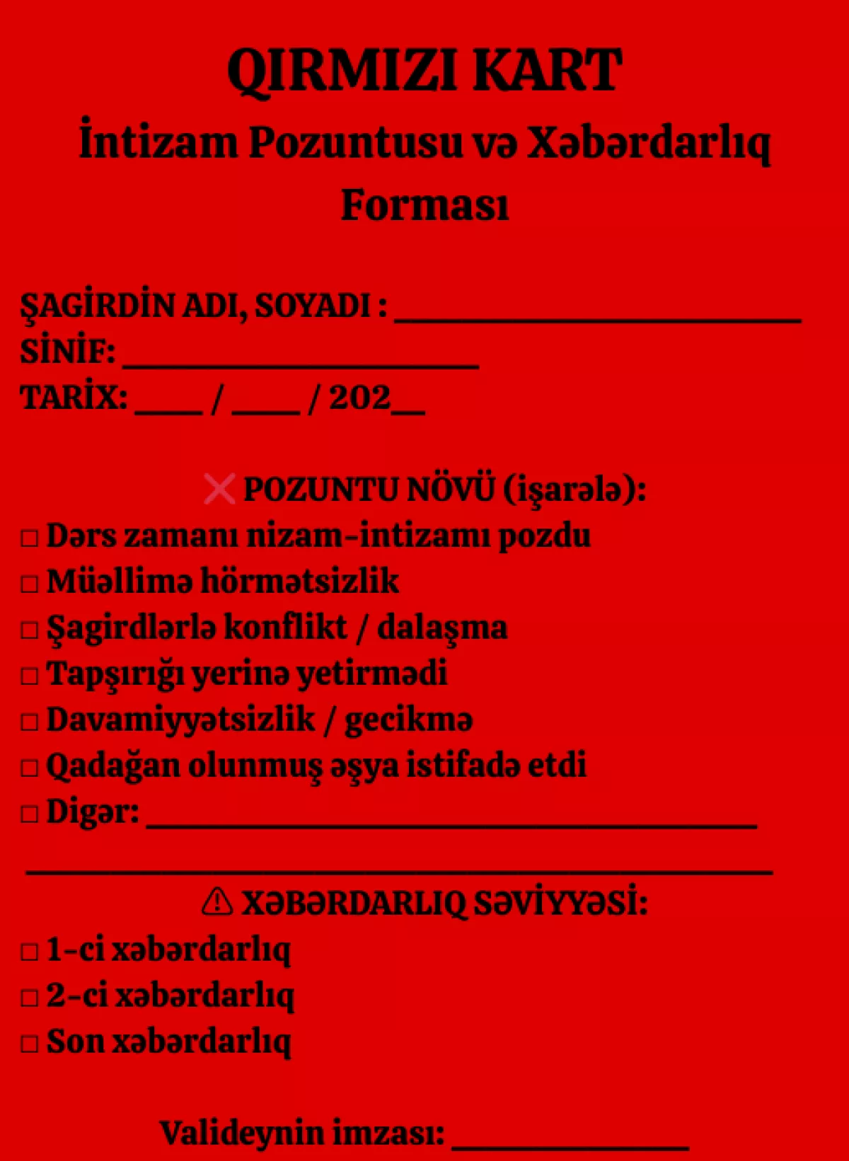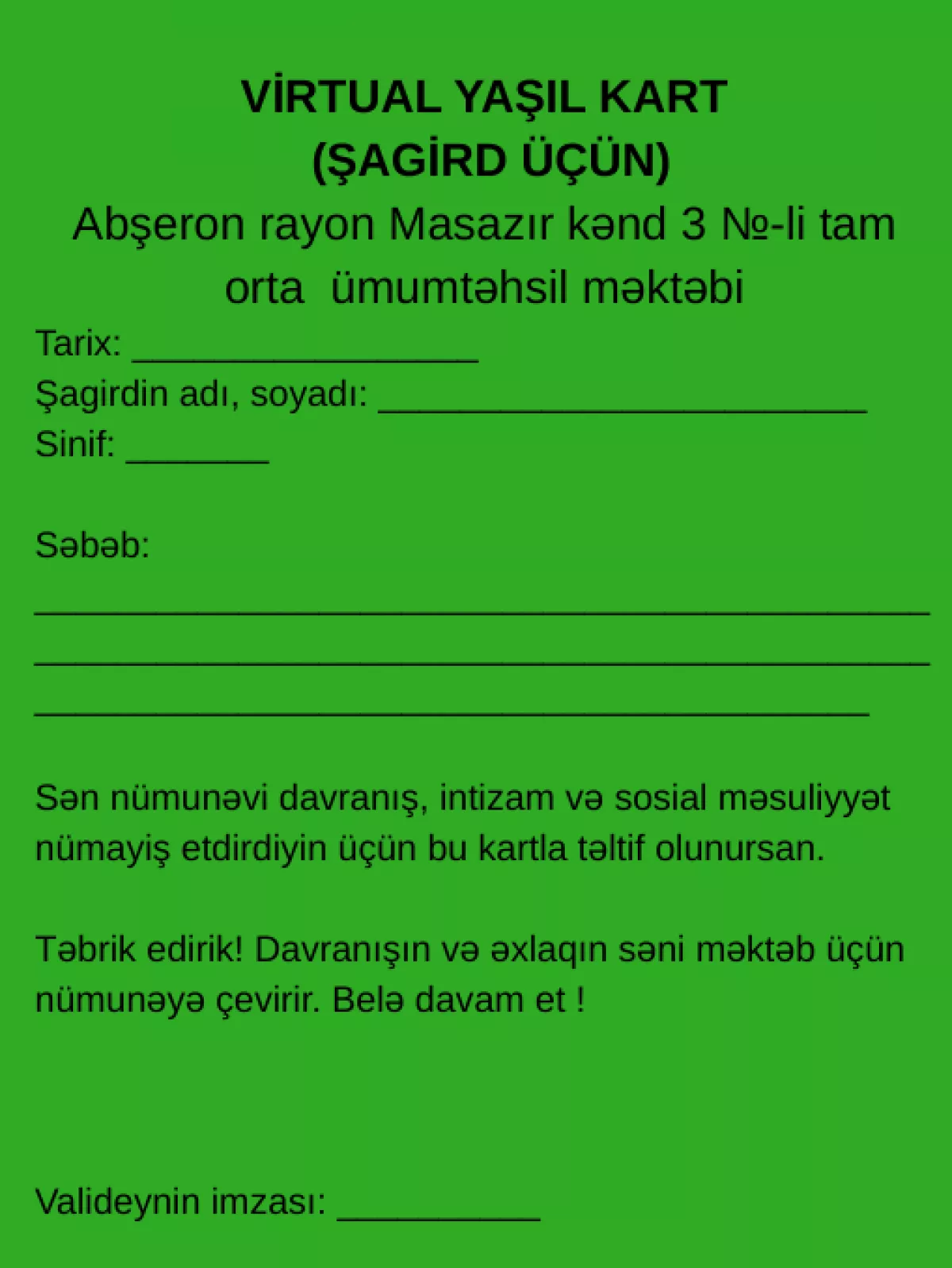 В средней школе № 3 посёлка Масазыр Апшеронского района АР осуществляется пилотный проект оценки поведения и успеваемости учащихся с помощью жёлтых, красных и зелёных карточек.