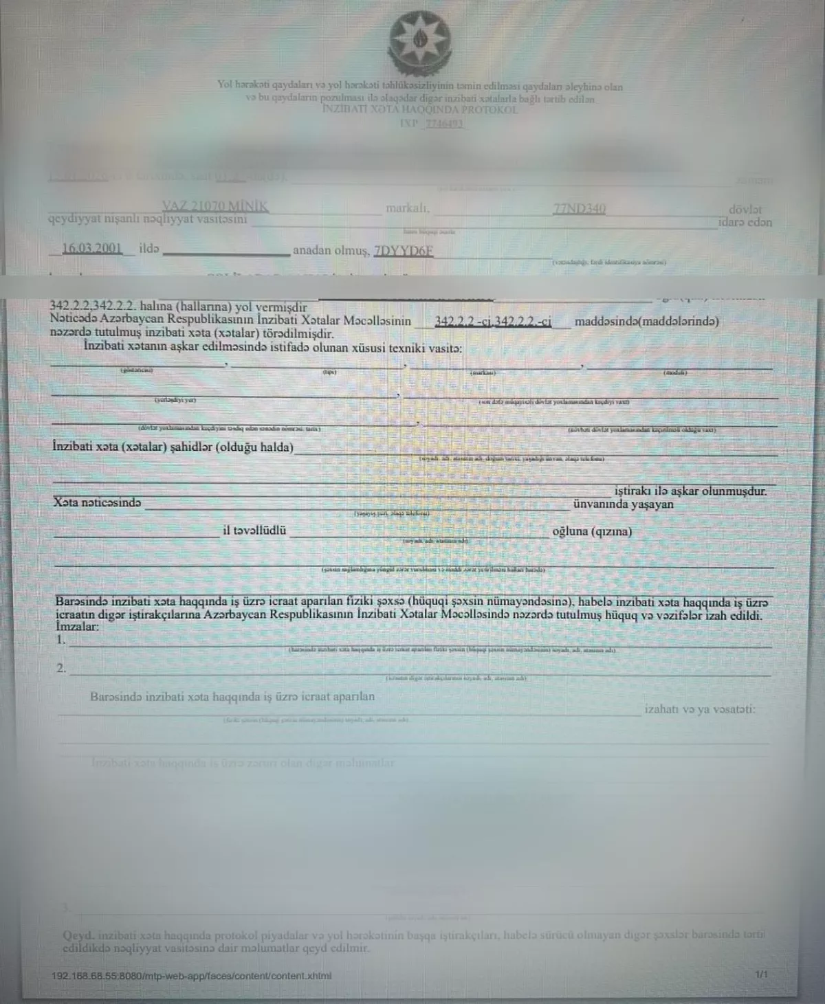 водитель автомобиля ВАЗ-2107 (госномер 77-ND-340) был оштрафован по статье 342.2 Кодекса об административных правонарушениях АР.