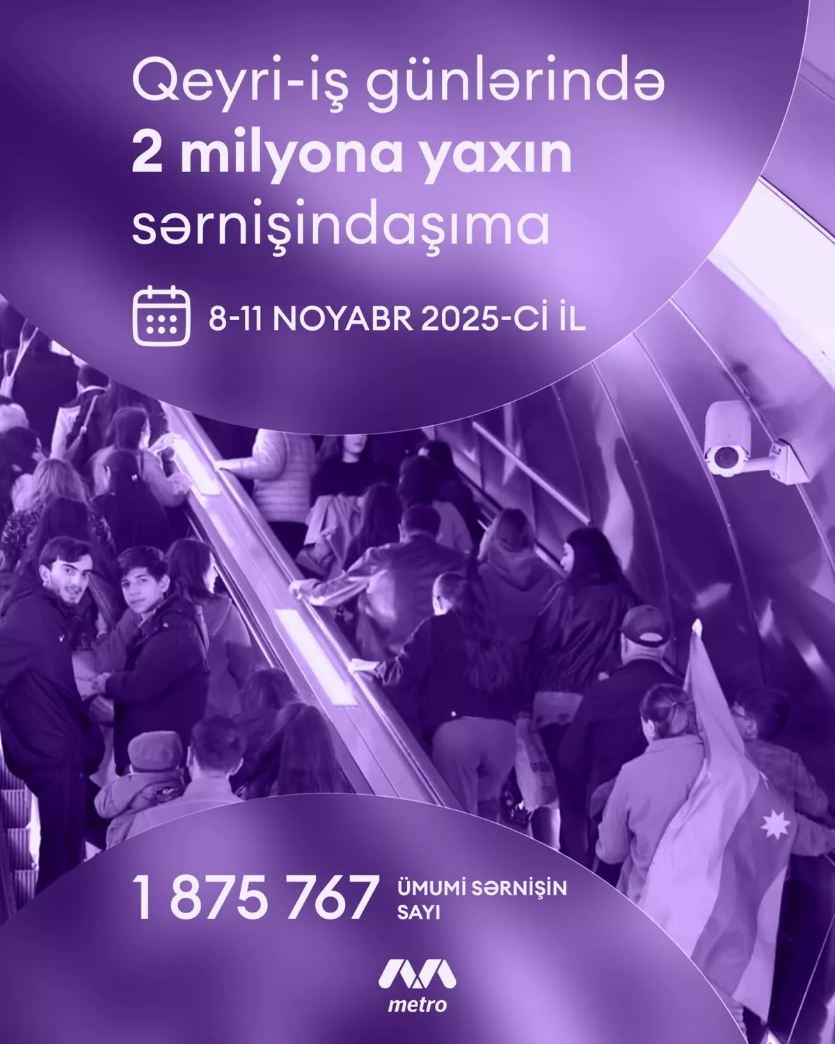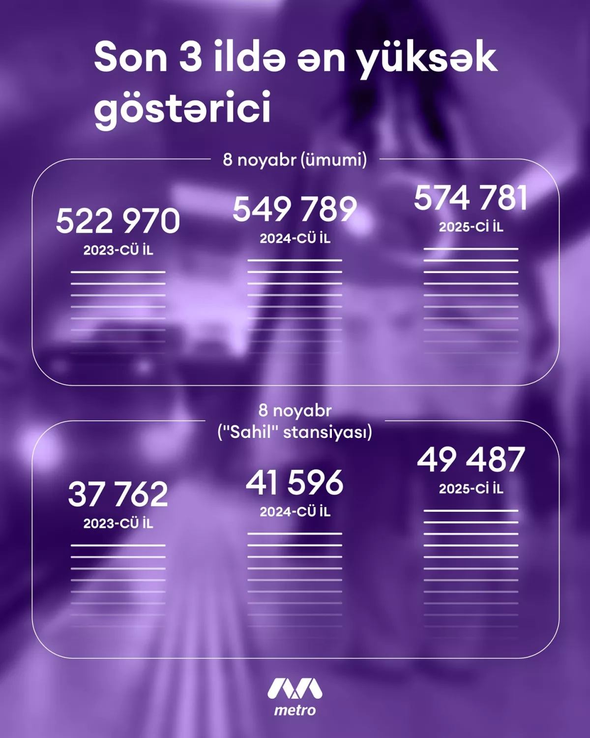 Кроме того, 8 ноября суточный рекорд за последние 3 года установлен и на станции «Сахил», которой воспользовалось 49 487 пассажиров. Это на 15,95% больше, чем в 2024 году, и на 23,69% больше, чем в 2023 году.