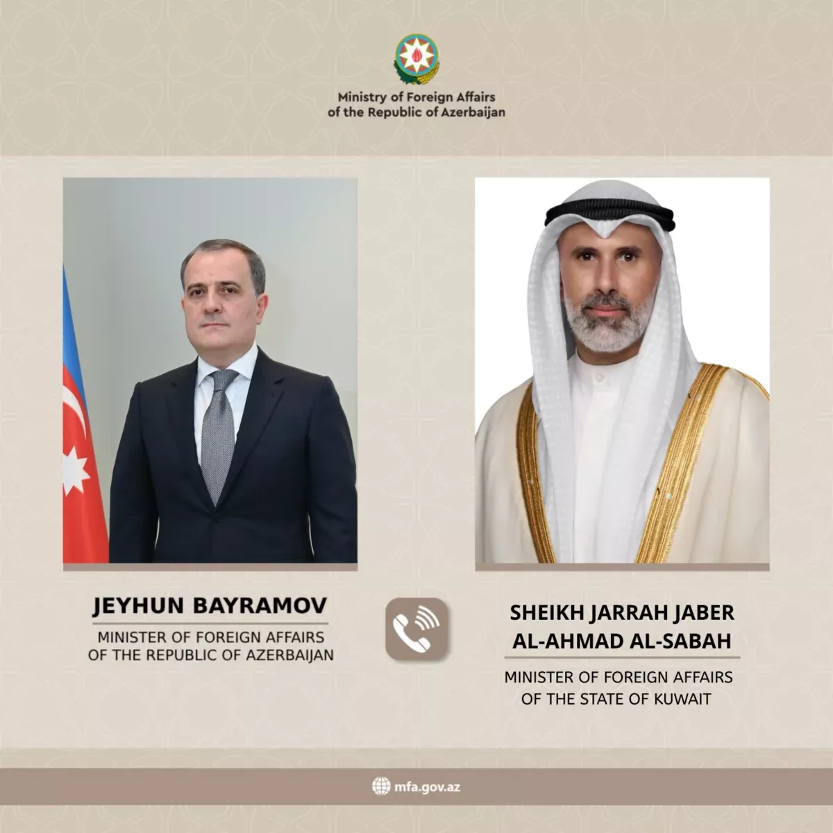 Министр иностранных дел Азербайджана Джейхун Байрамов провел телефонный разговор с кувейтским коллегой шейхом Джаррахом Джабером аль-Ахмедом аль-Сабахом, стороны обсудили ситуацию на Ближнем Востоке.