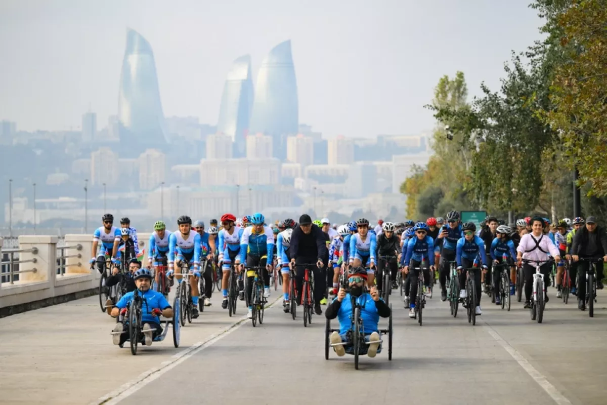 Более 300 профессиональных велосипедистов и любителей, включая паравелосипедистов, проехались по Приморскому бульвару в направлении Парка Победы. От района Crescent Mall до Парка Победы их сопровождали мотоциклисты с флагами Азербайджана.